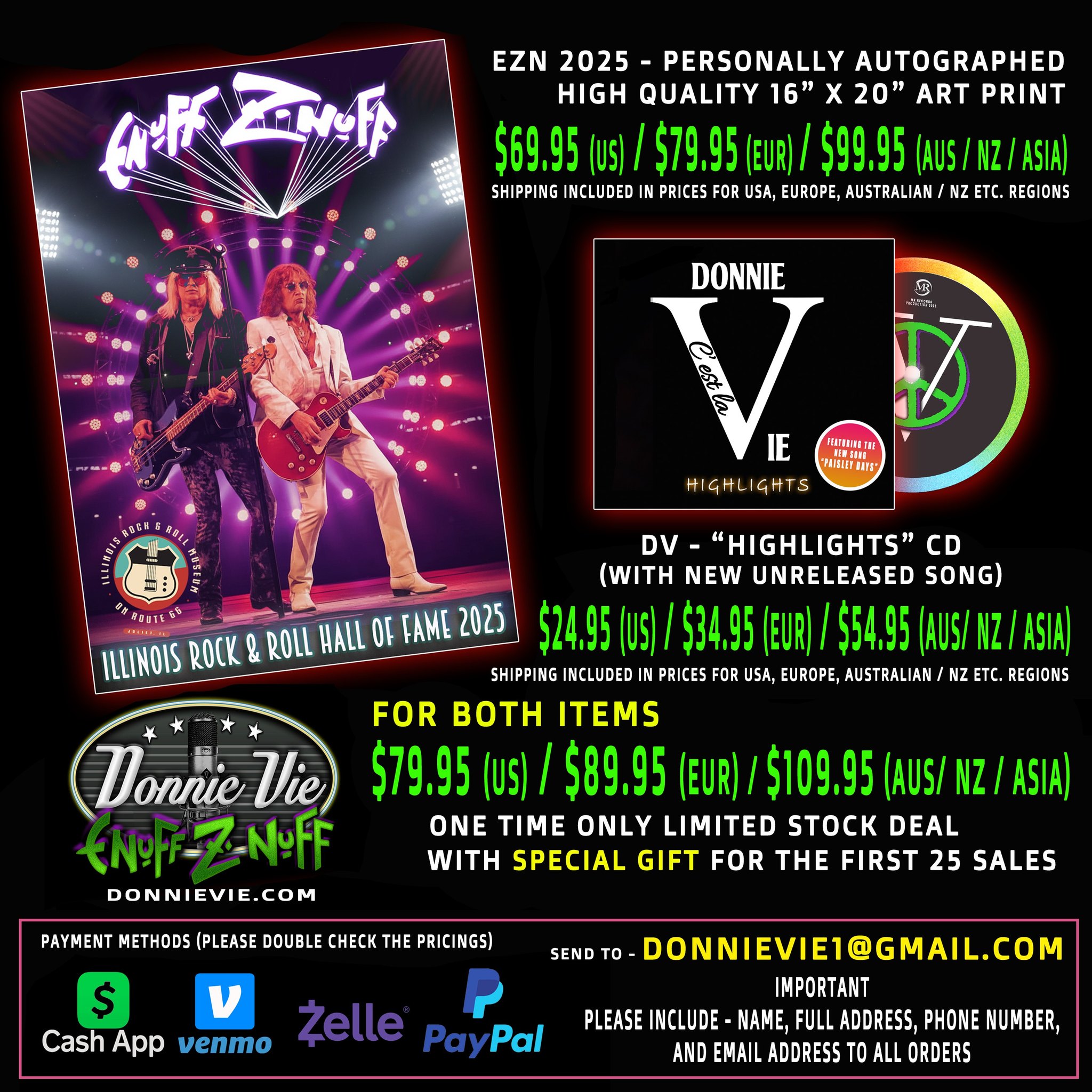2025年9月にイリノイロックの殿堂入りを果たしたイナフズナフ。これを記念して画像にあるポスターが作成されまして、11月よりドニーソロのベスト盤である『DV – Highlights』(いまだにアルバムの正式名称がわからん…)と一緒に売り出されました。